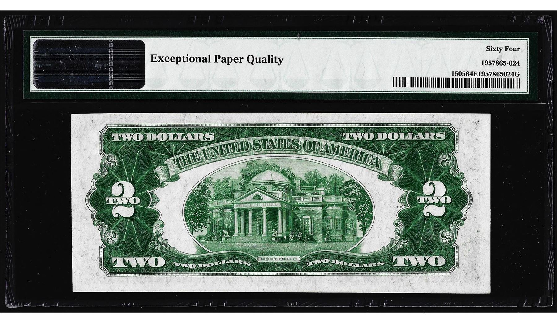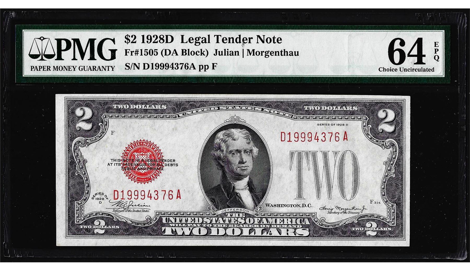 One 1928D $2 Legal Tender Note Fr.1505 PMG Choice Uncirculated 64EPQ. PMG Certified.