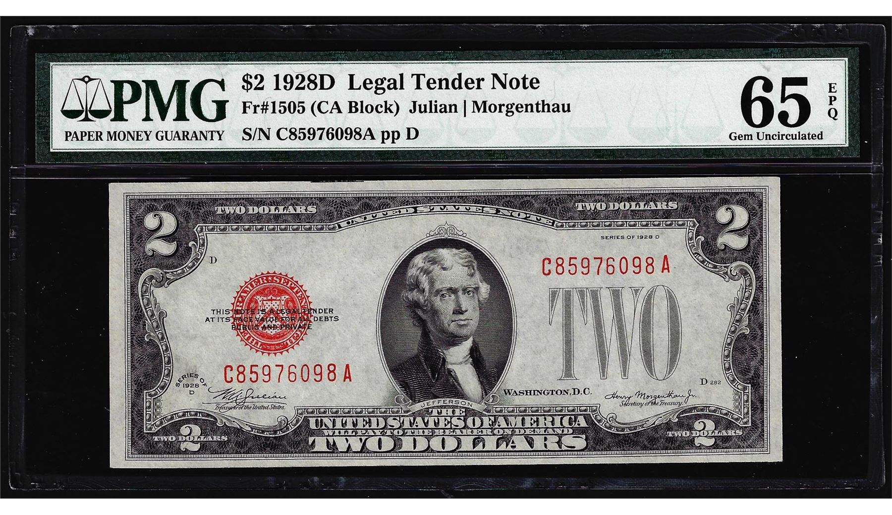 One 1928D $2 Legal Tender Note Fr.1505 PMG Gem Uncirculated 65EPQ. PMG Certified.
