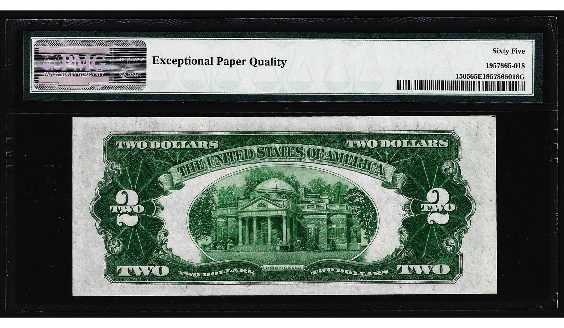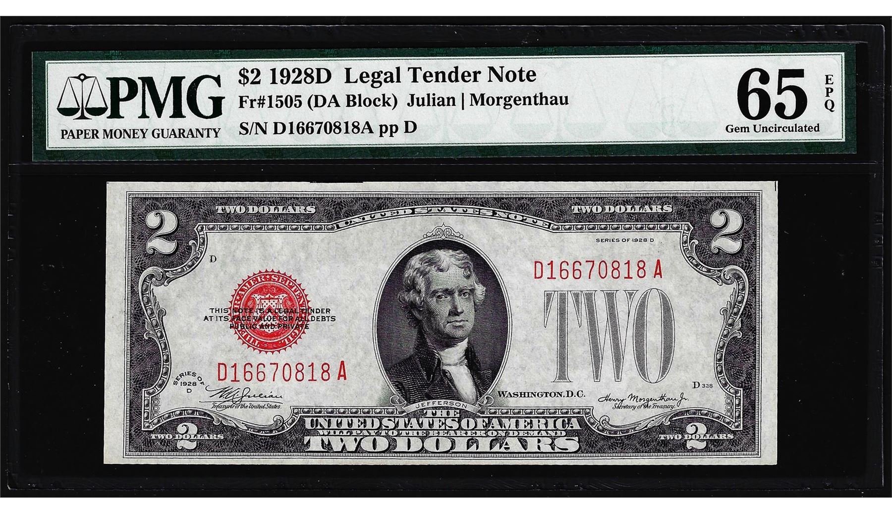 One 1928D $2 Legal Tender Note Fr.1505 PMG Gem Uncirculated 65EPQ. PMG Certified.