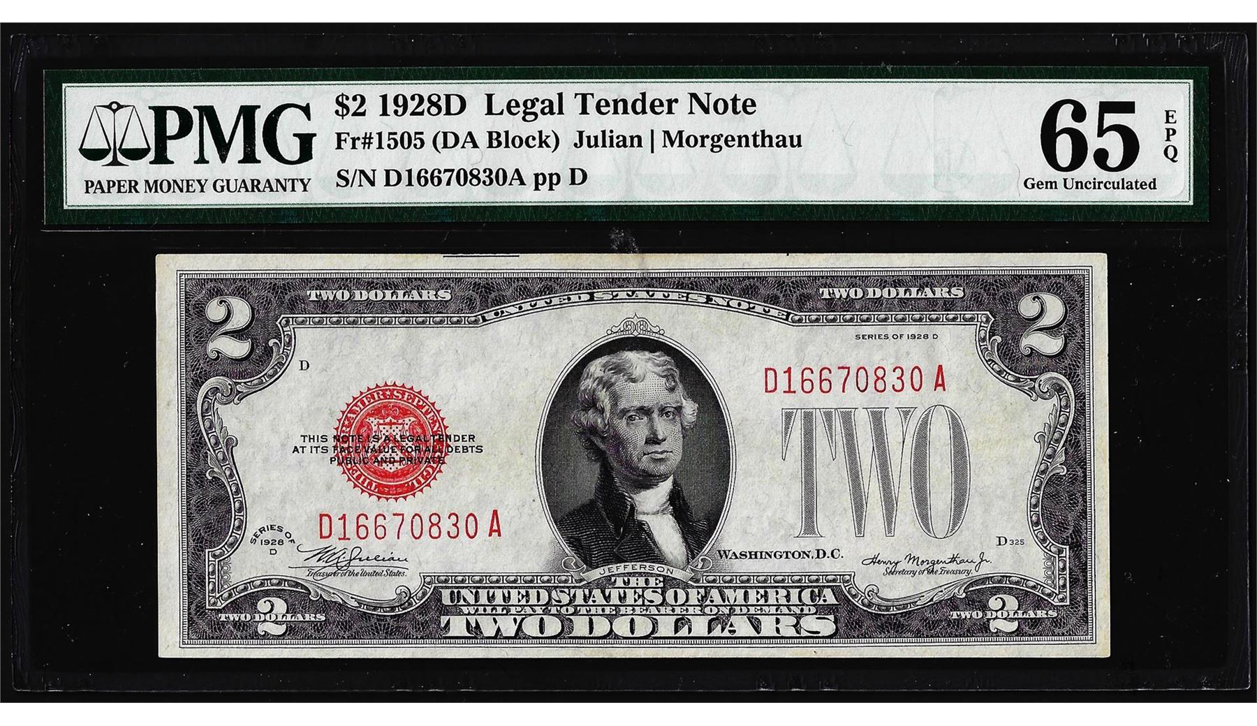 One 1928D $2 Legal Tender Note Fr.1505 PMG Gem Uncirculated 65EPQ. PMG Certified.
