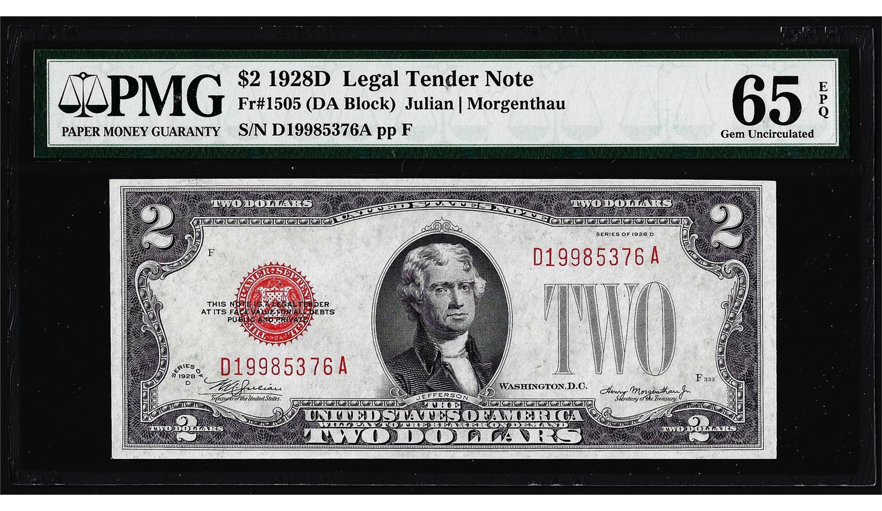 One 1928D $2 Legal Tender Note Fr.1505 PMG Gem Uncirculated 65EPQ. PMG Certified.
