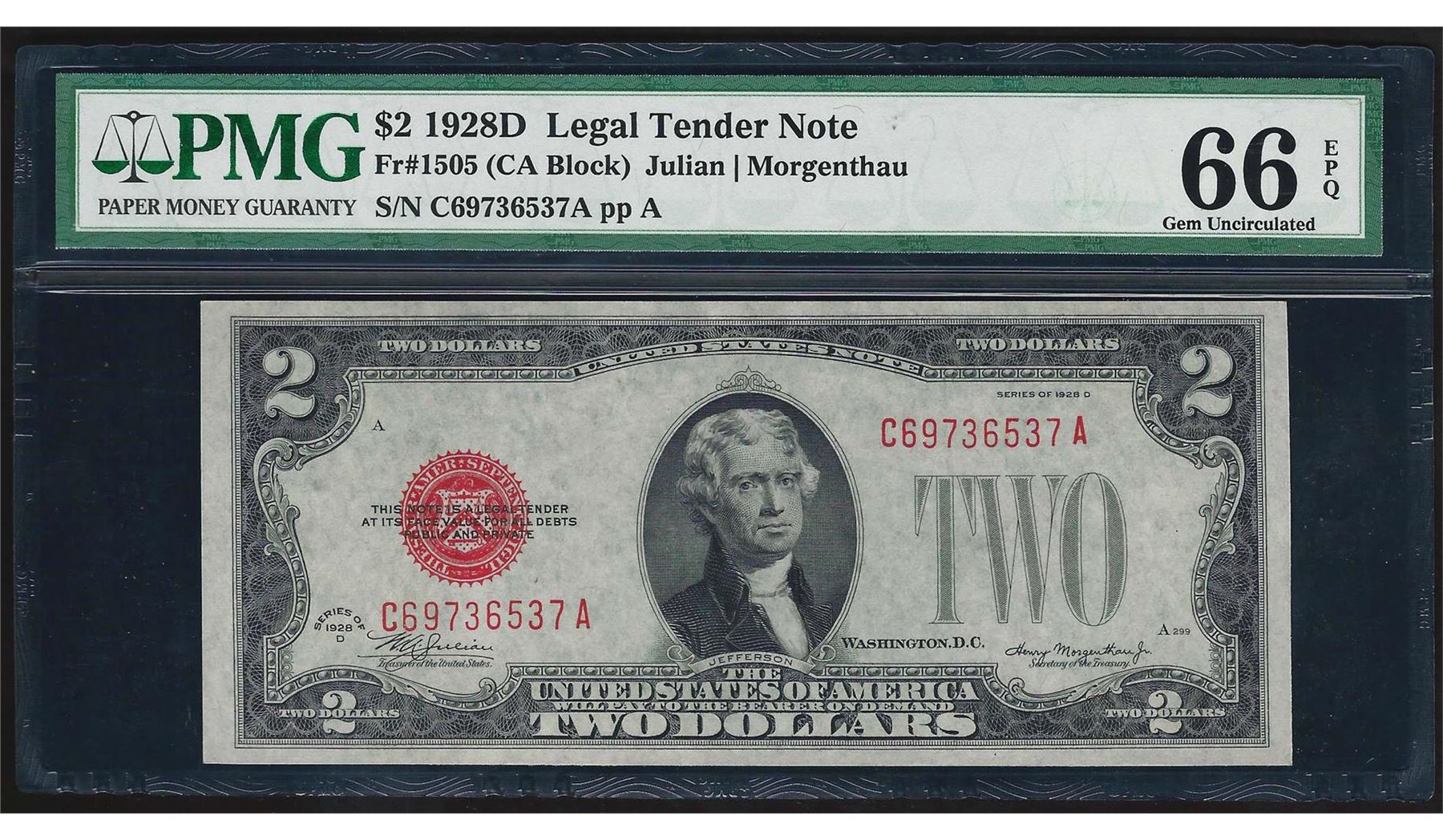 One 1928D $2 Legal Tender Note Fr.1505 PMG Gem Uncirculated 66EPQ. PMG Certified.