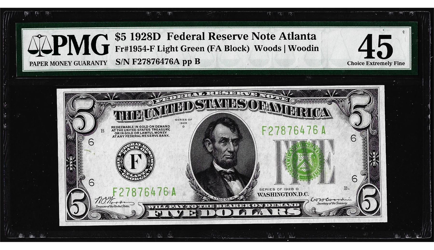 One 1928D $5 Federal Reserve Note Atlanta Fr.1954-F PMG Choice Extremely Fine 45. PMG Certified.