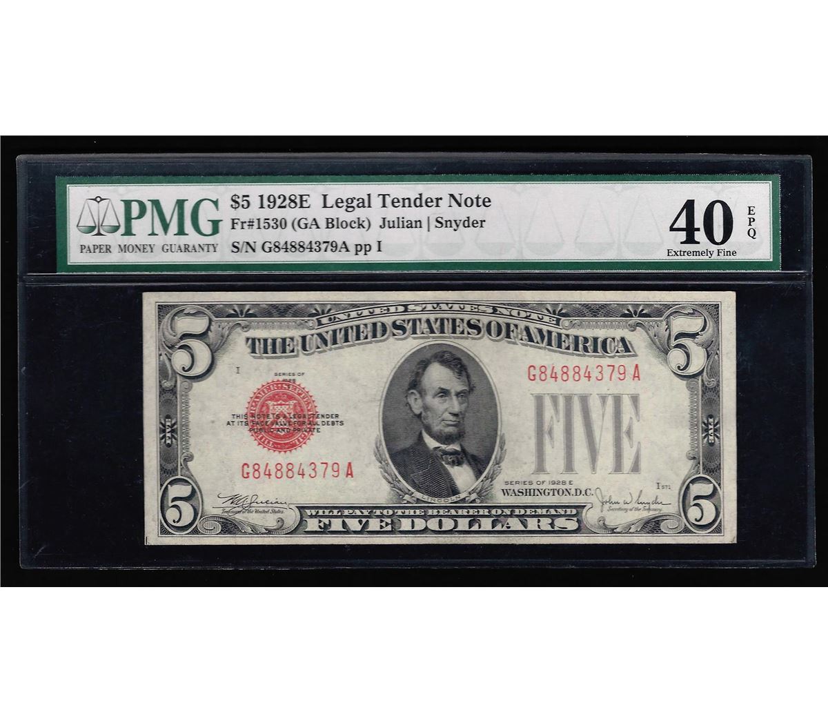 One 1928E $5 Red Seal Legal Tender Note PMG XF40 EPQ. PMG Certified.