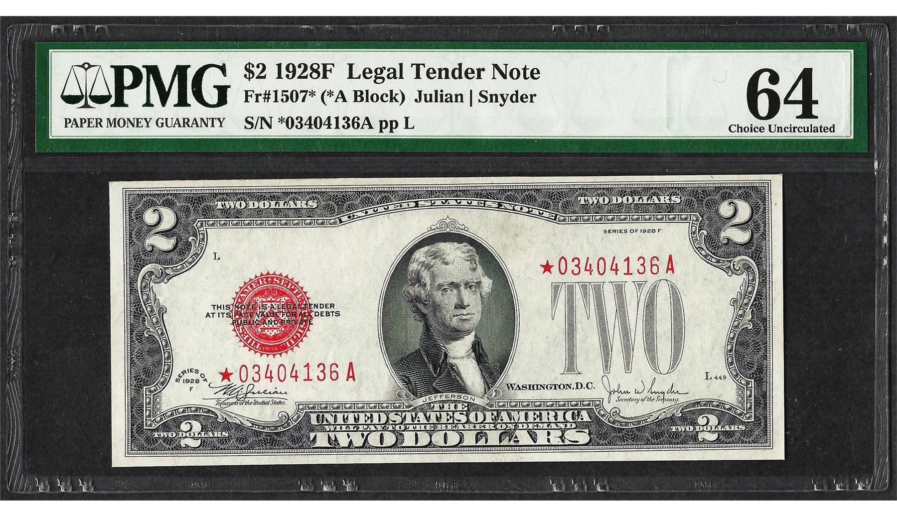 One 1928F $2 Legal Tender Note Fr.1507* PMG Choice Uncirculated 64. PMG Certified.