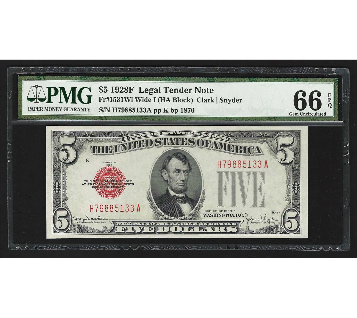 One 1928F $5 Legal Tender Note PMG 66EPQ. PMG Certified.