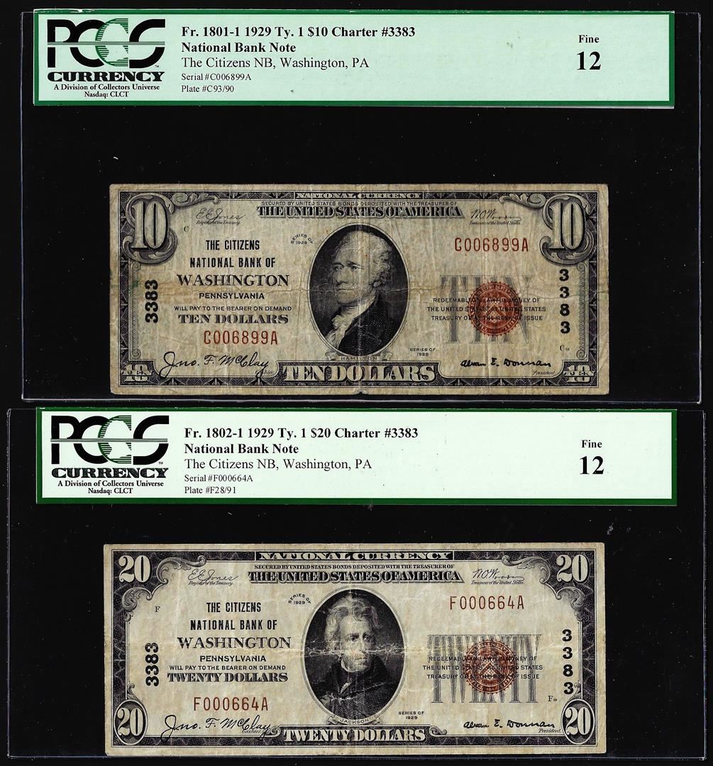 1929 $10/20 Citizens NB Washington, PA CH# 3383 National Currency Notes PCGS F12
