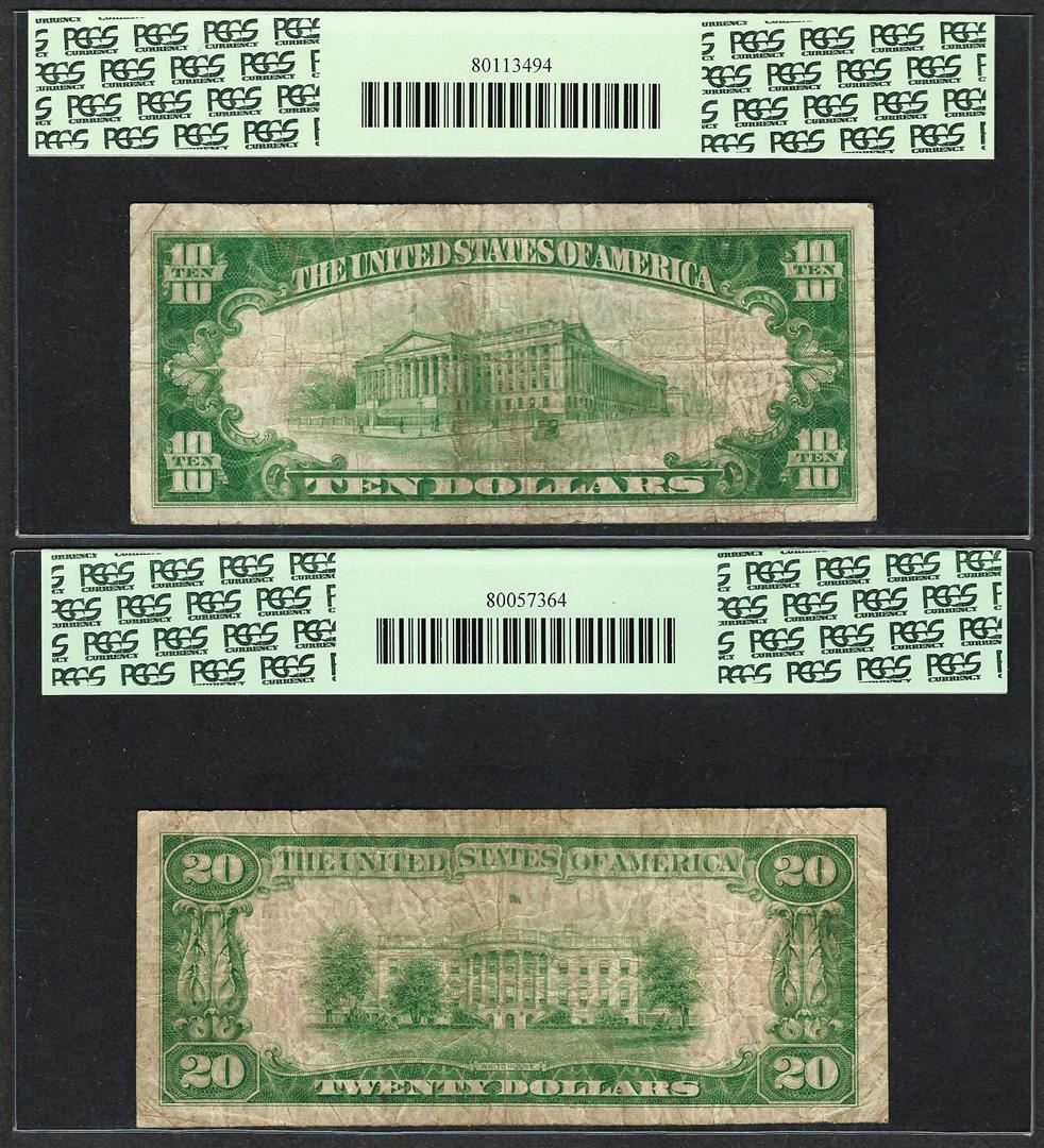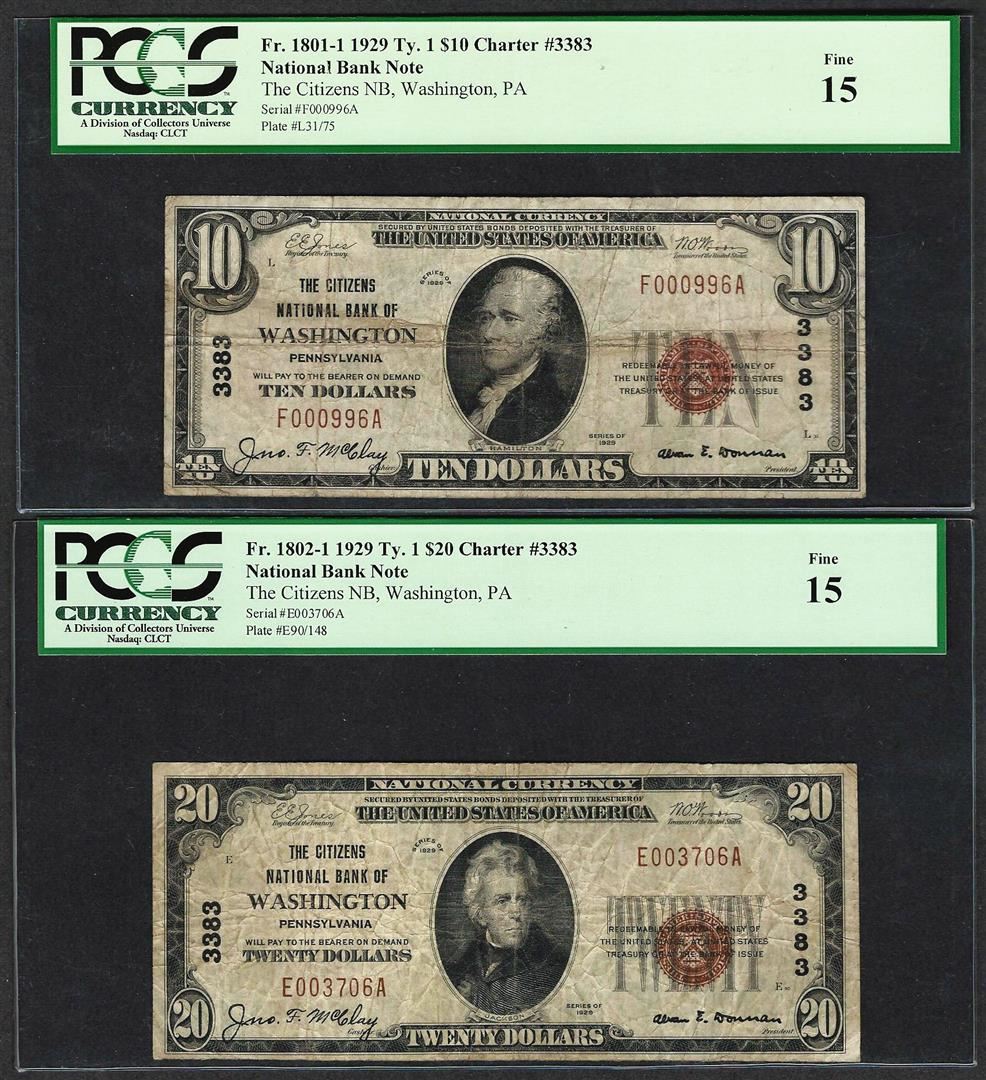 1929 $10/20 Citizens NB Washington, PA CH# 3383 National Currency Notes PCGS F15