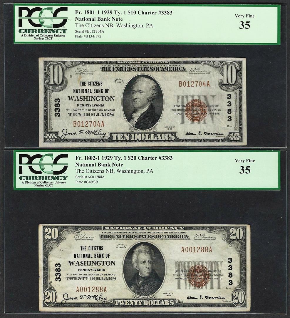 1929 $10/20 Citizens NB Washington, PA CH# 3383 National Currency Notes PCGS VF35