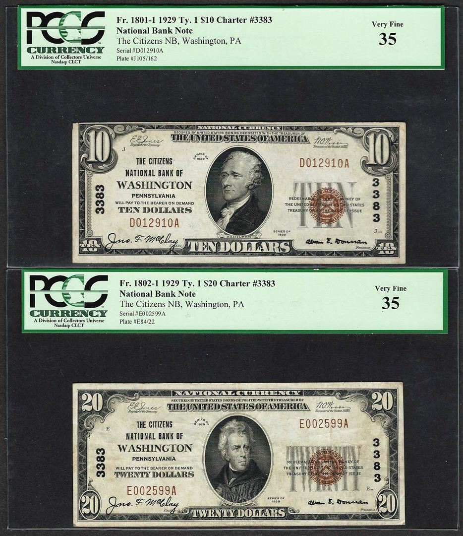 1929 $10/20 Citizens NB Washington, PA CH# 3383 National Currency Notes PCGS VF35