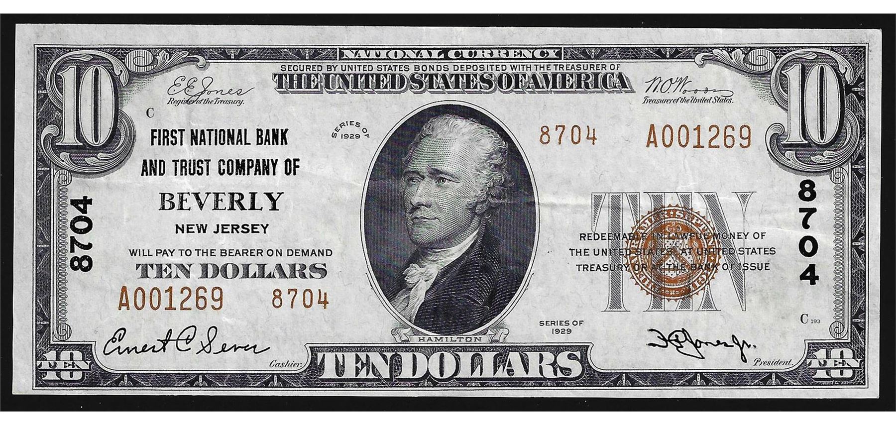 One 1929 $10 Beverly New Jersey National Currency Note.