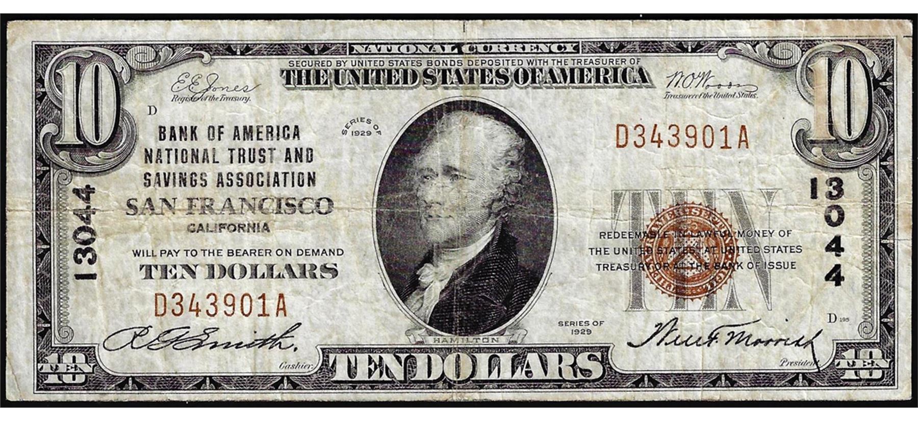 One 1929 $10 BofA San Francisco, CA CH# 13044 National Currency Note.
