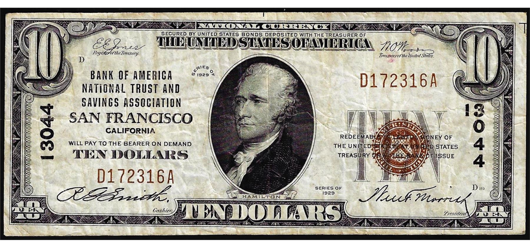 One 1929 $10 BofA San Francisco, CA CH# 13044 National Currency Note.