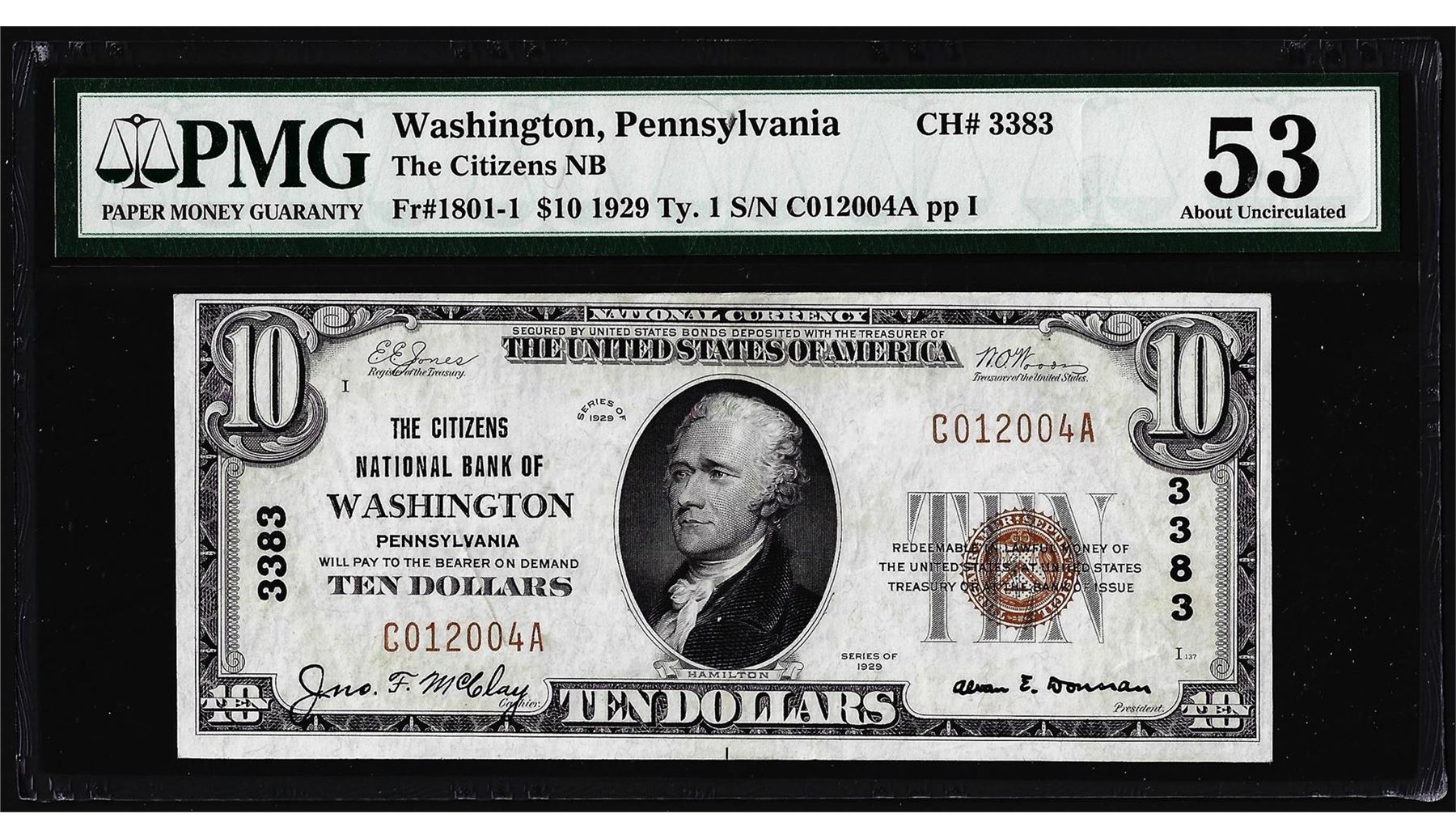 One 1929 $10 Citizens NB Washington, PA CH# 3383 National Note PMG About Uncirculated 53. PMG Certified.