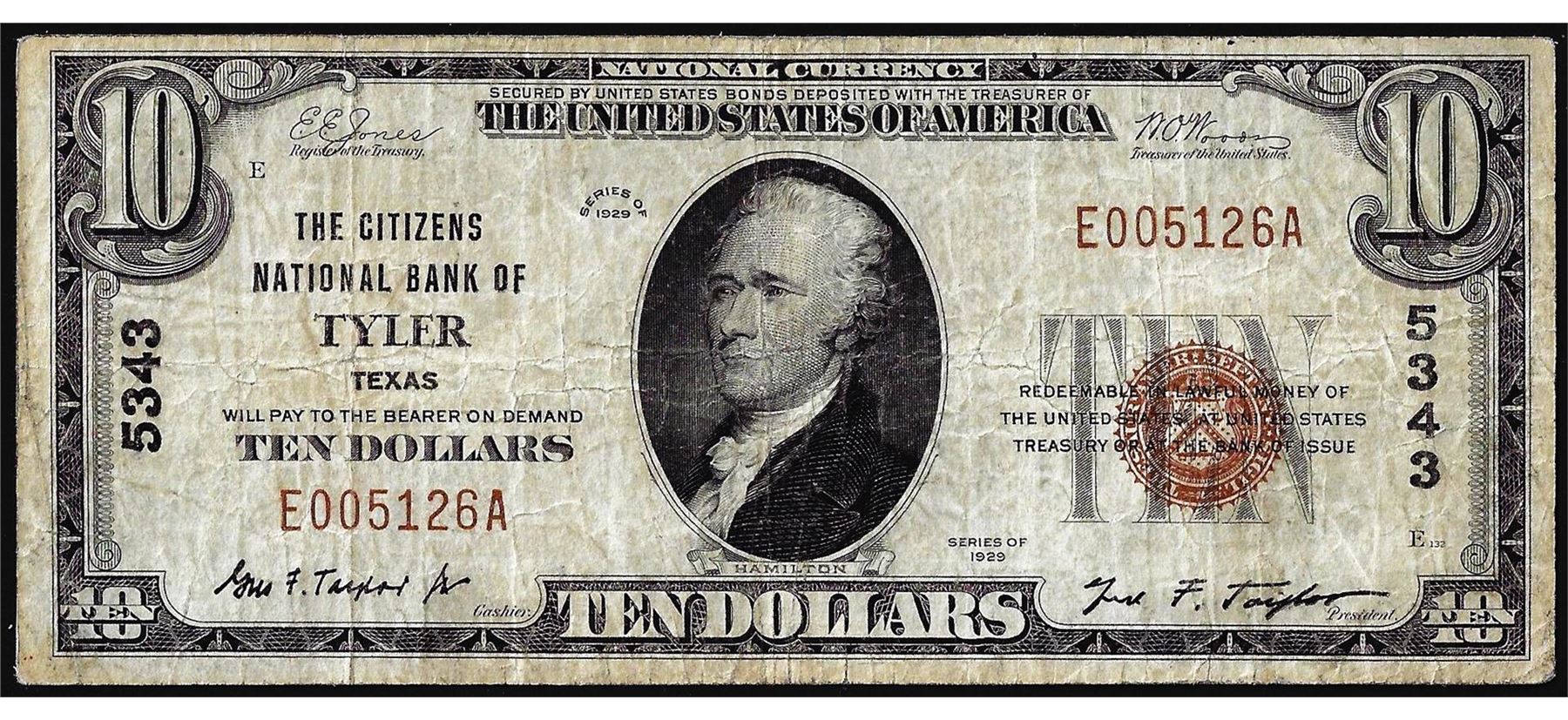 One 1929 $10 Citizens National Bank of Tyler, Texas CH# 5343 National Currency Note.