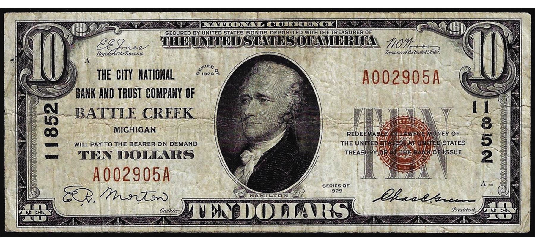 One 1929 $10 City NB and Trust Battle Creek, MI CH# 11852 National Currency Note.