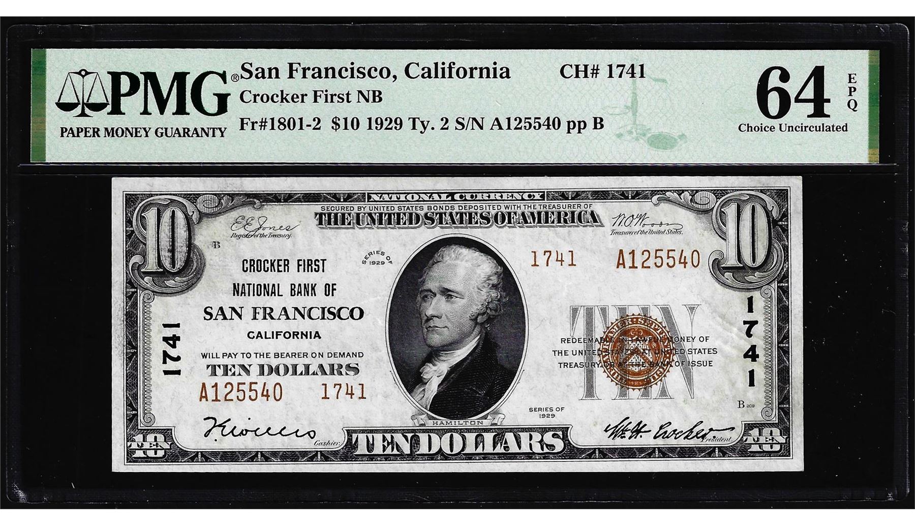 One 1929 $10 Crocker San Francisco National Note CH# 1741 PMG Choice Uncirculated 64EPQ. PMG Certified.