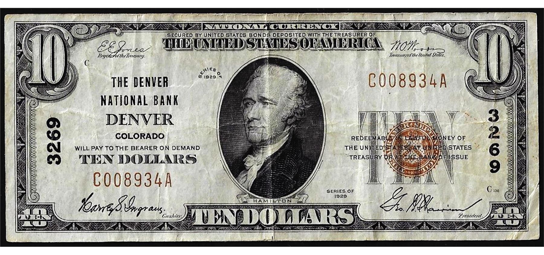 One 1929 $10 Denver, CO CH# 3269 National Currency Note.