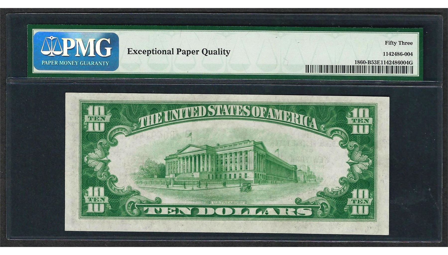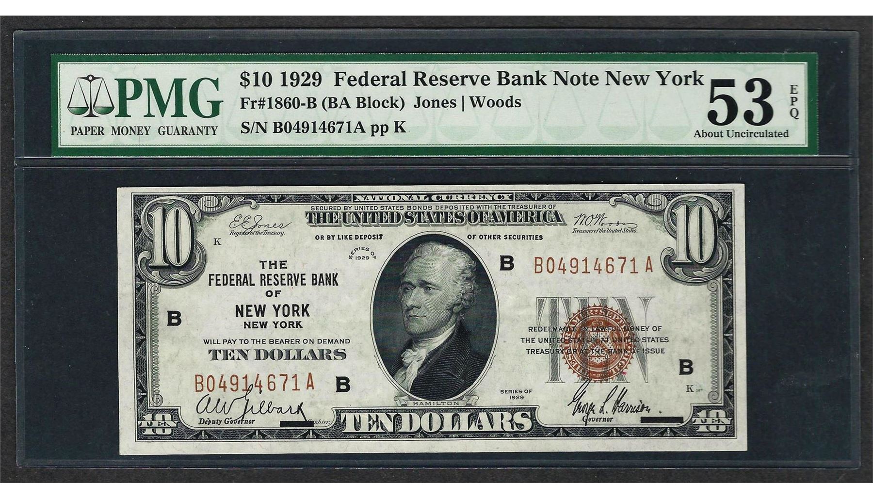 One 1929 $10 Federal Bank of New York Note Fr.1860-B PMG About Uncirculated 53EPQ. PMG Certified.