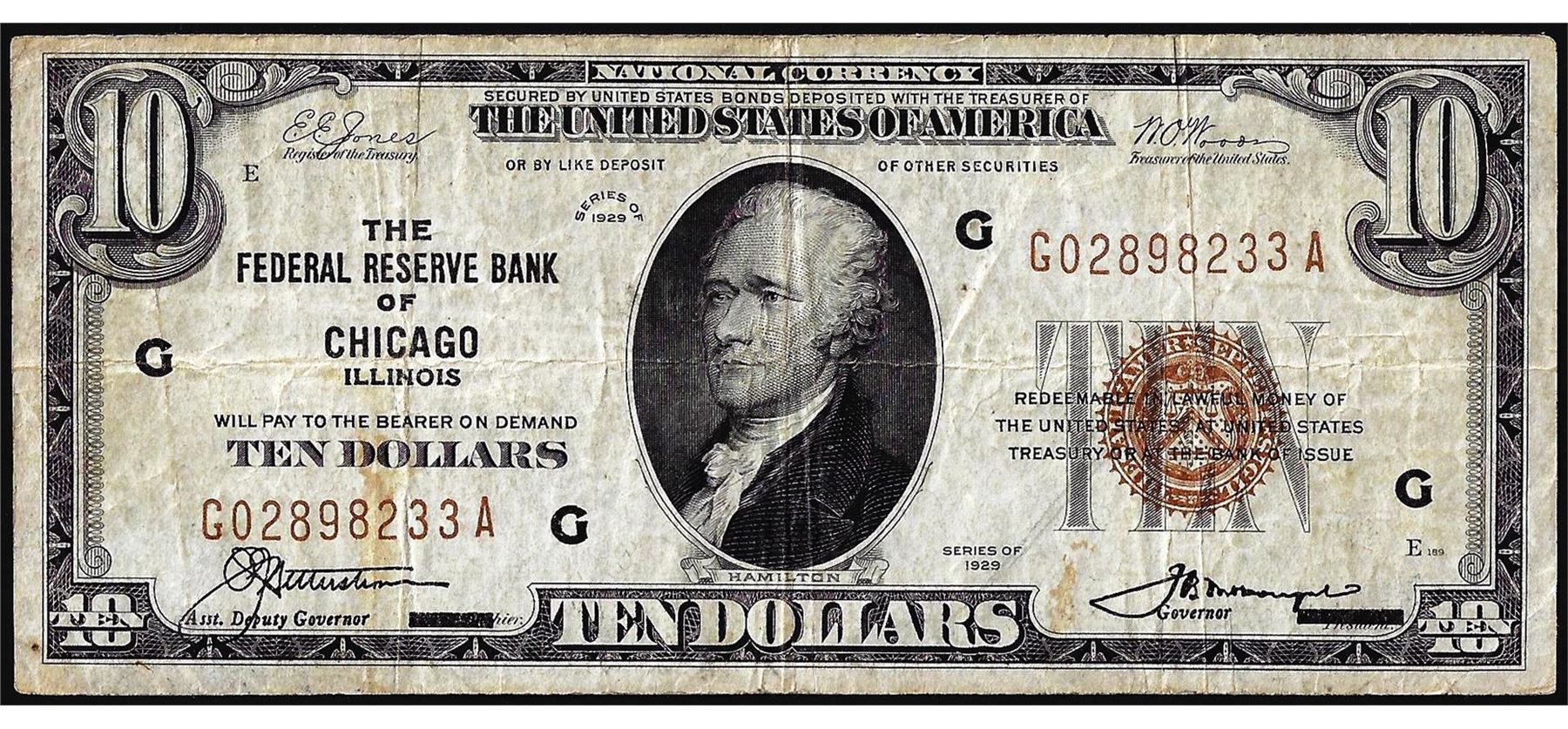 One 1929 $10 Federal Reserve Bank Note Chicago.