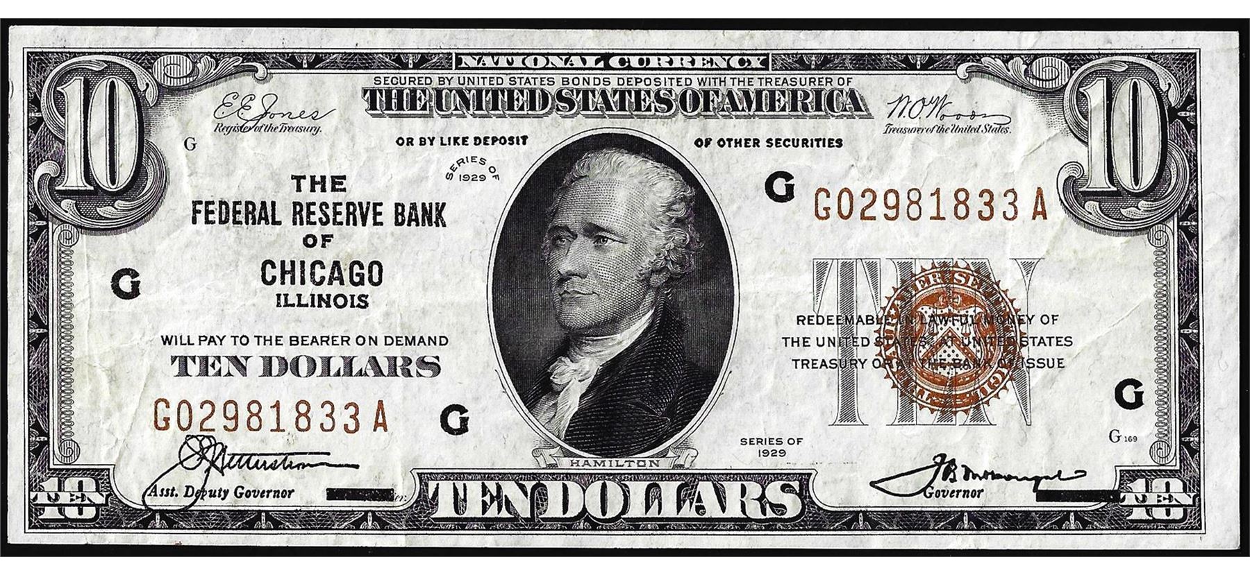 One 1929 $10 Federal Reserve Bank Note Chicago.