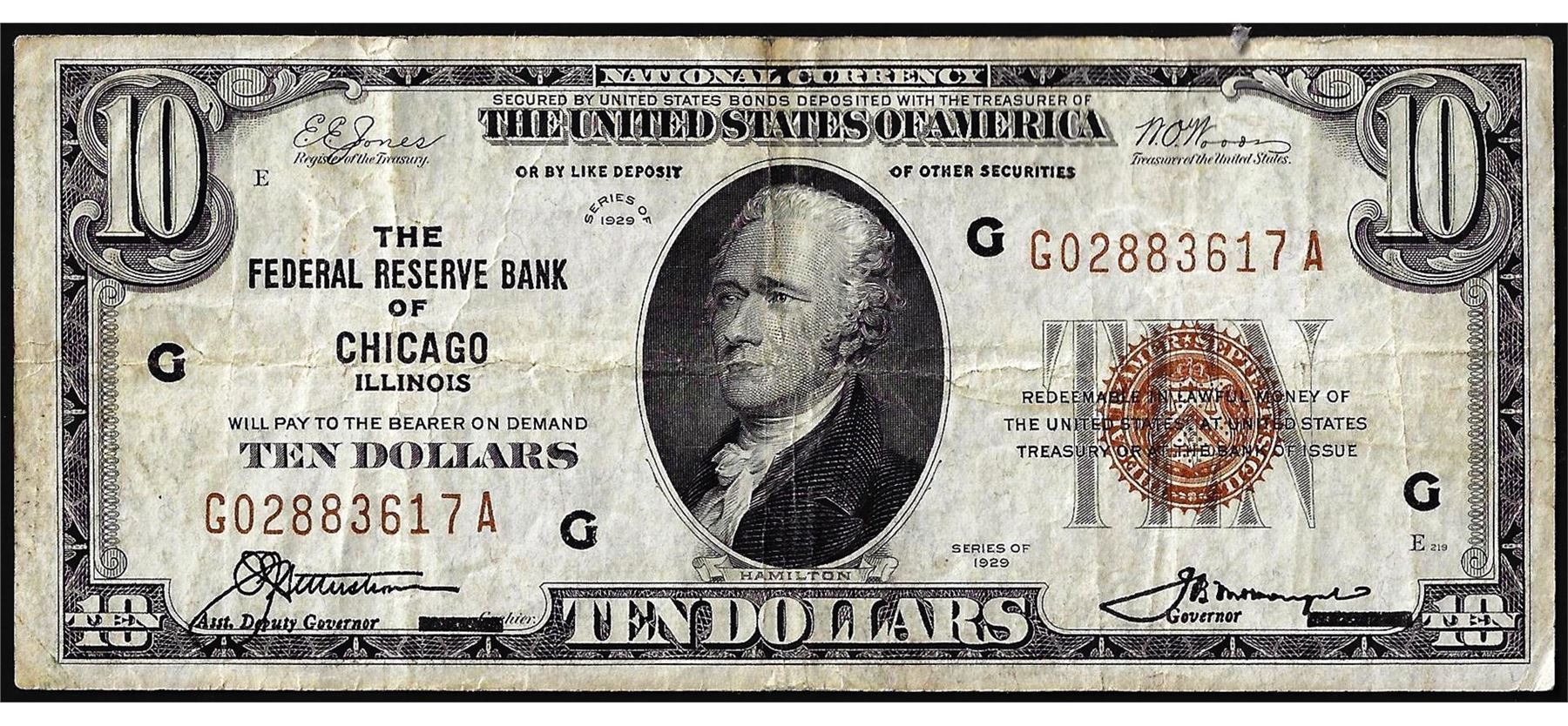 One 1929 $10 Federal Reserve Bank Note Chicago.