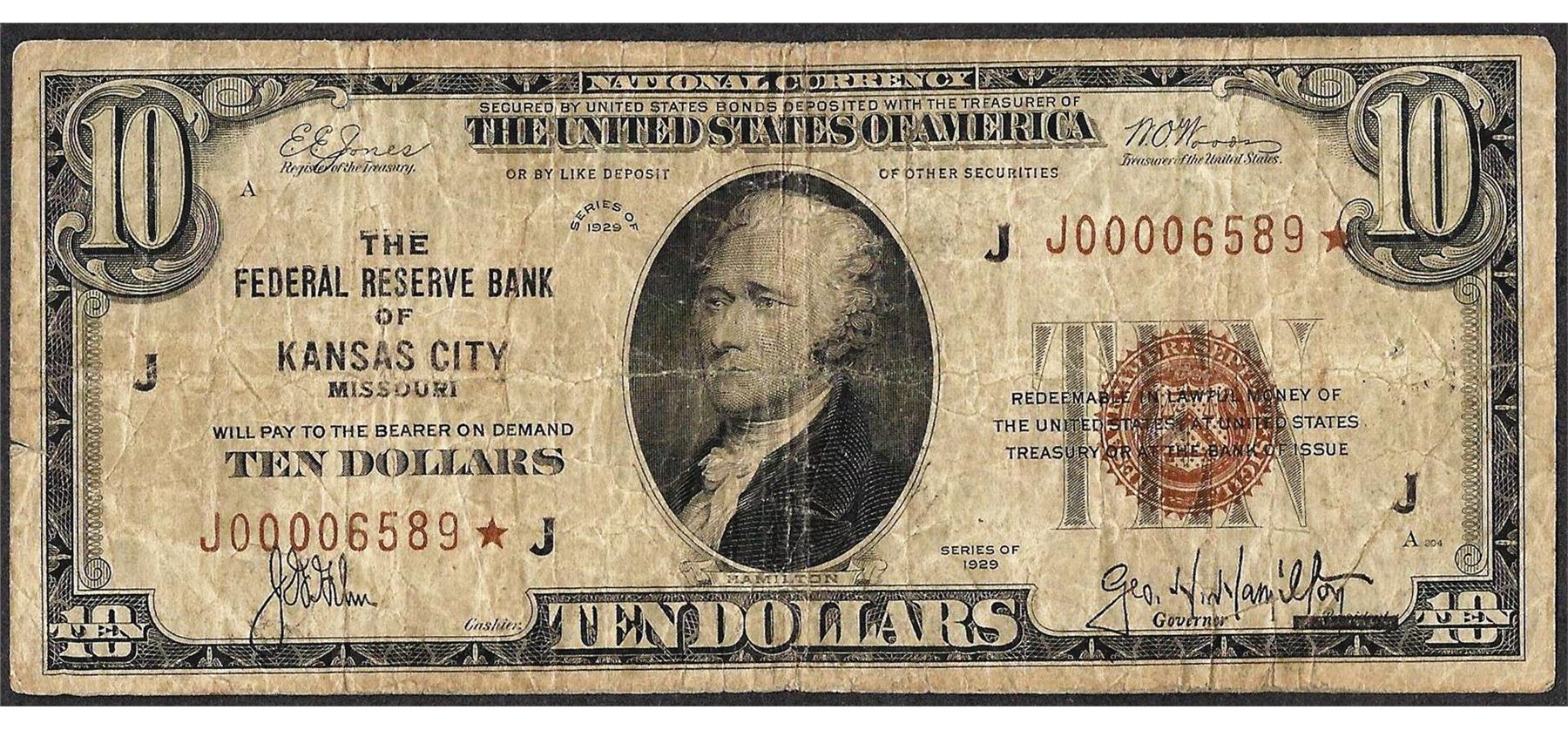 One 1929 $10 Federal Reserve Bank of Kansas City, MO STAR Note.