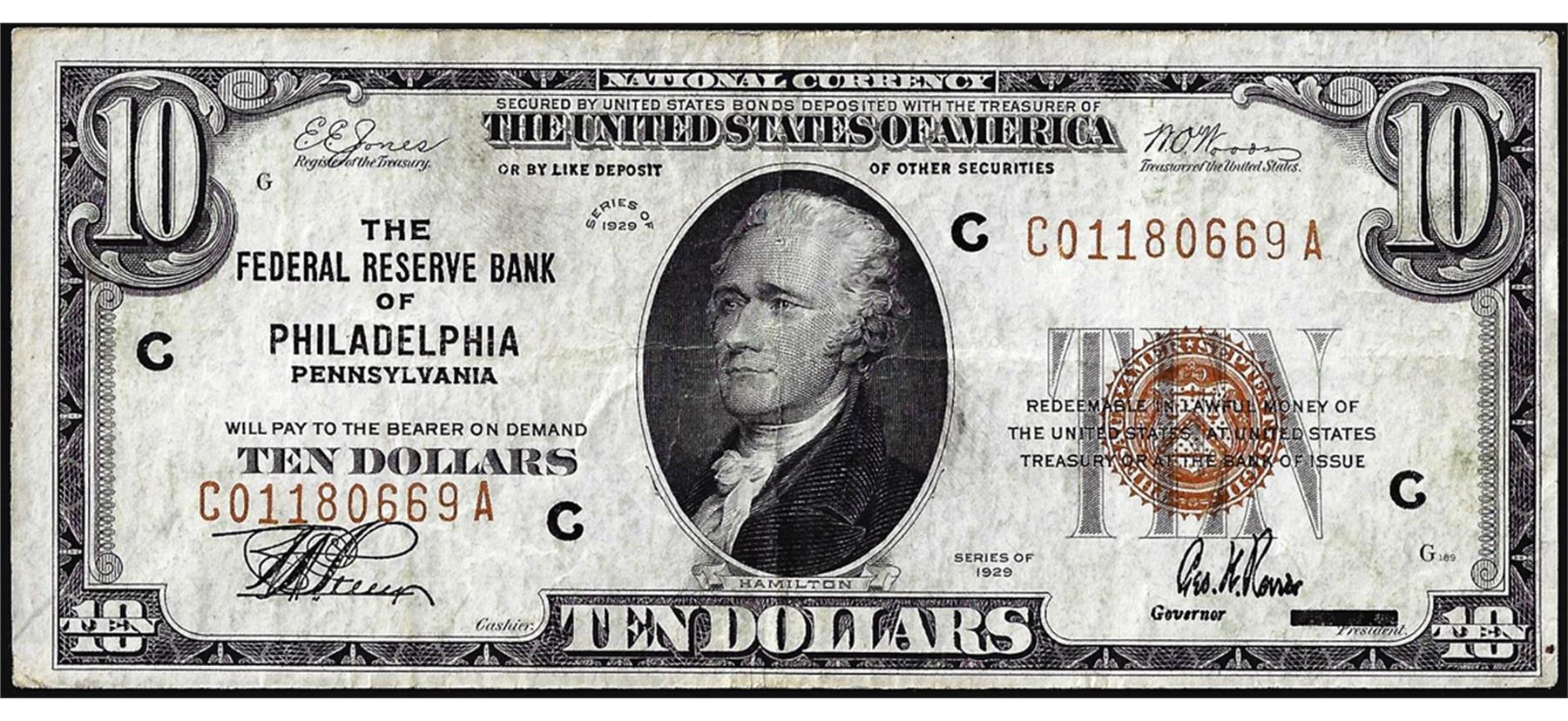 One 1929 $10 Federal Reserve Bank of Philadelphia Note.