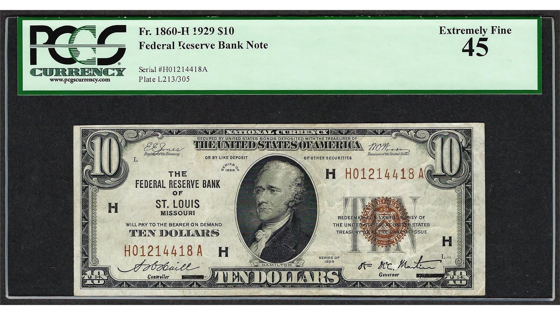 One 1929 $10 Federal Reserve Bank of St. Louis Currency Note Fr.1860-H PCGS Extremely Fine 45. PCGS Graded.