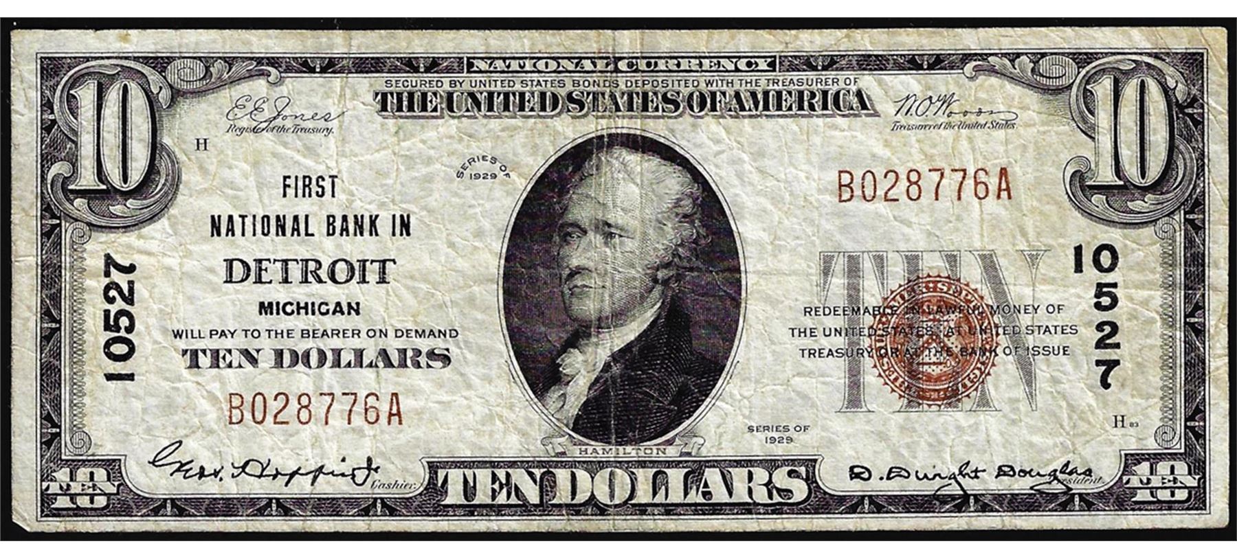 One 1929 $10 First NB Detroit, MI CH# 10527 National Currency Note.