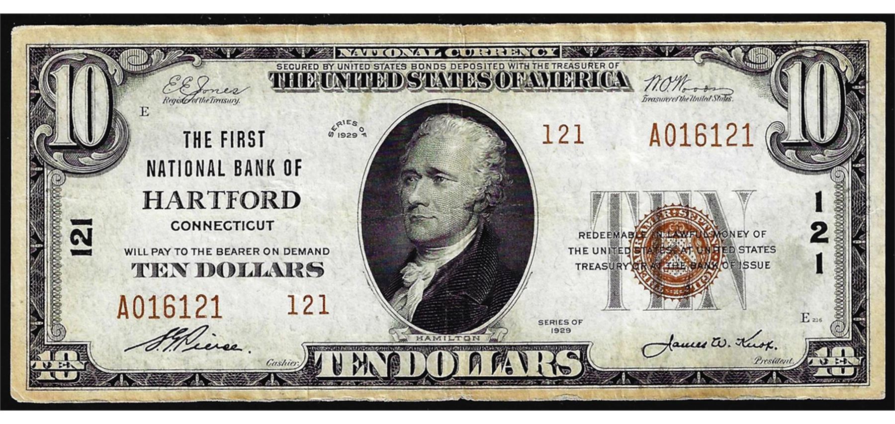 One 1929 $10 First NB Hartford, CT CH# 121 National Currency Note.