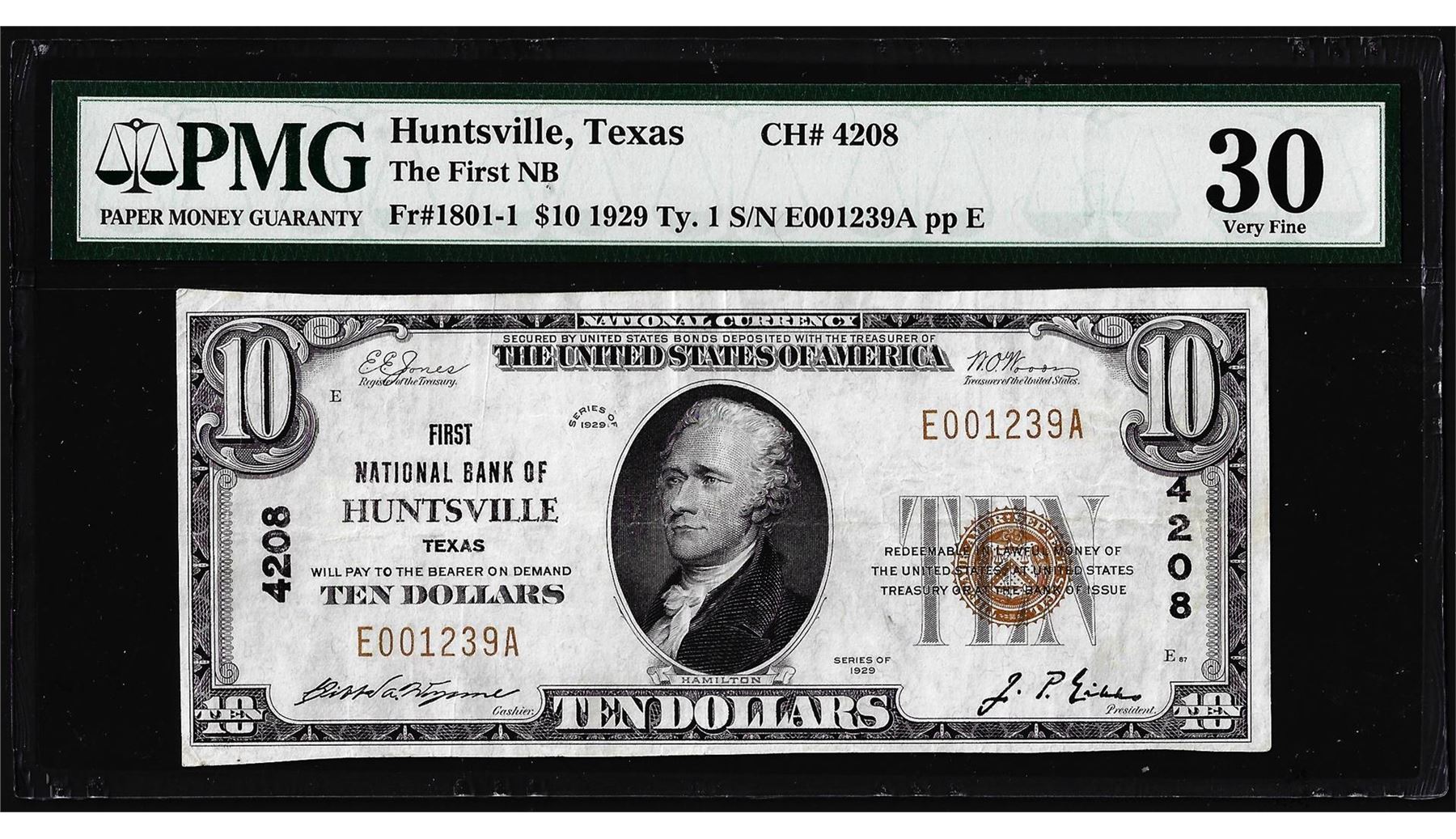 One 1929 $10 First NB Huntsville, Texas National Currency Note CH#4208 PMG Very Fine 30. PMG Certified.