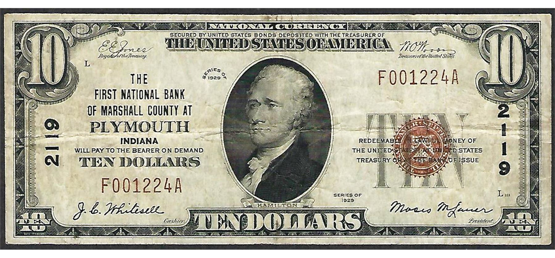 One 1929 $10 First NB of Marshall County Plymouth, IN CH# 2119 National Currency Note.