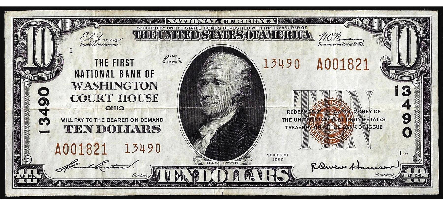 One 1929 $10 First NB of Washington Court House, Ohio CH# 13490 National Currency Note.