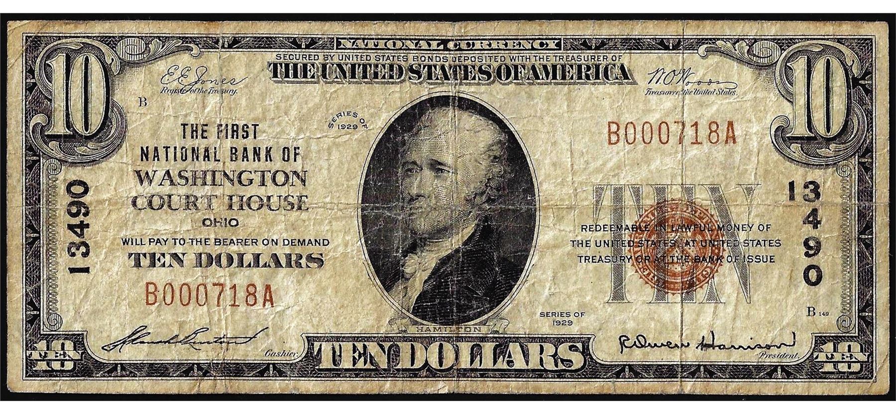 1929 $10 First NB of Washington Court House, Ohio CH# 13490 National Currency Note