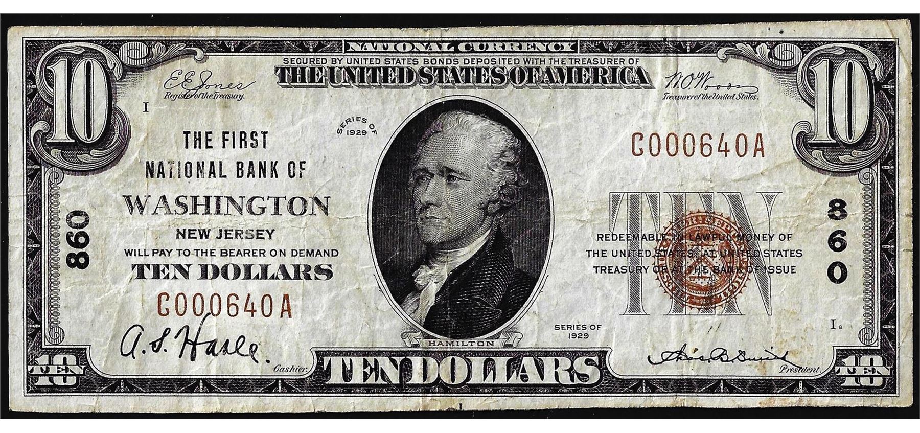 One 1929 $10 First NB of Washington, New Jersey CH# 860 National Currency Note.