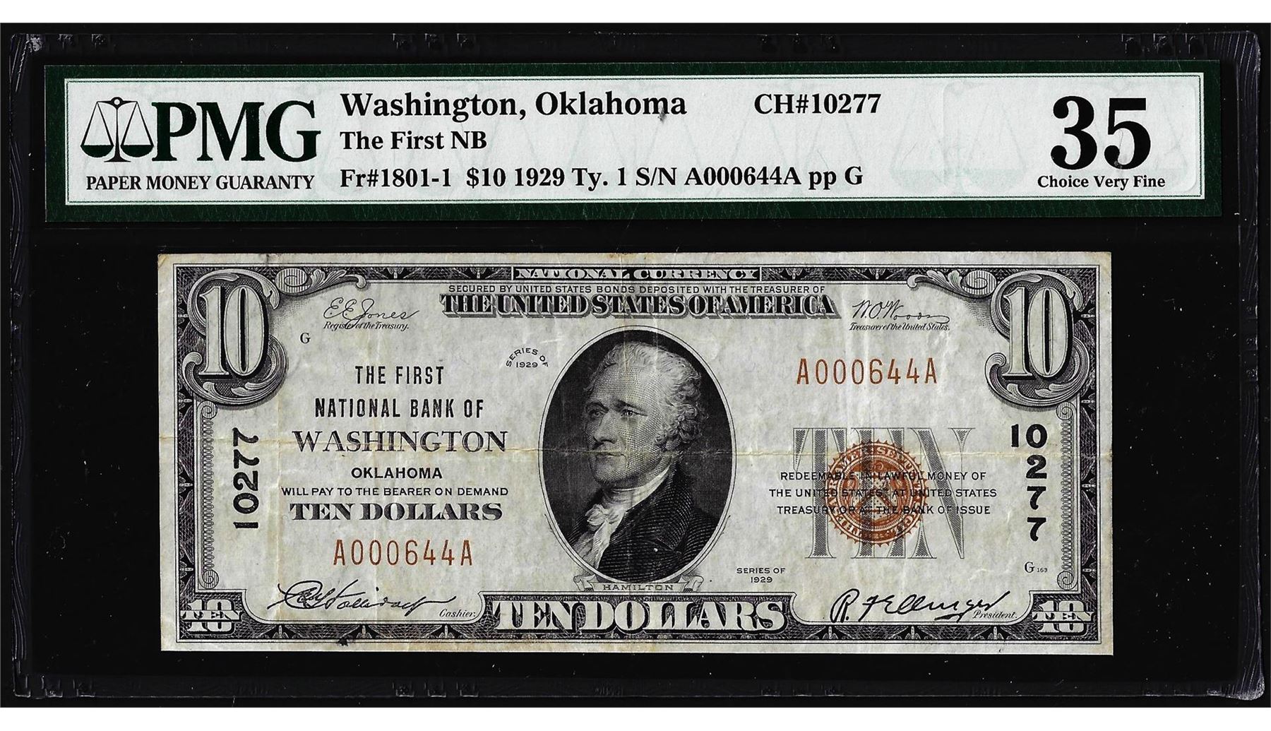 One 1929 $10 First NB of Washington, OK CH# 10277 National Currency Note PMG Choice Very Fine 35. PMG Certified.