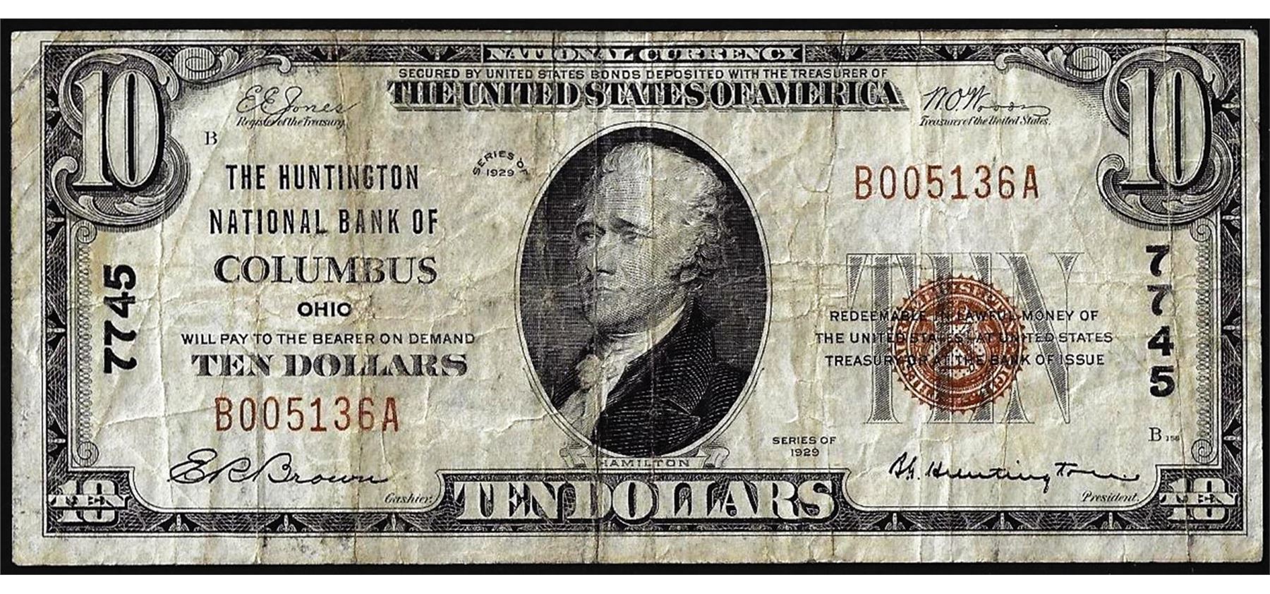 One 1929 $10 Huntington NB of Columbus, OH CH# 7745 National Currency Note.