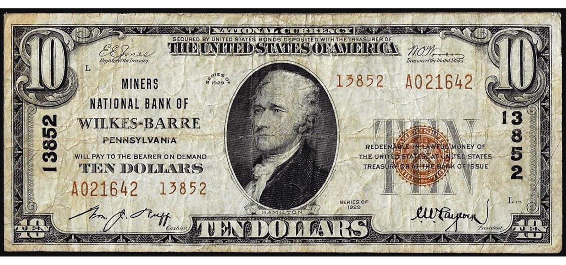 One 1929 $10 Miners NB of Wilkes Barre, PA CH# 13852 National Currency Note.