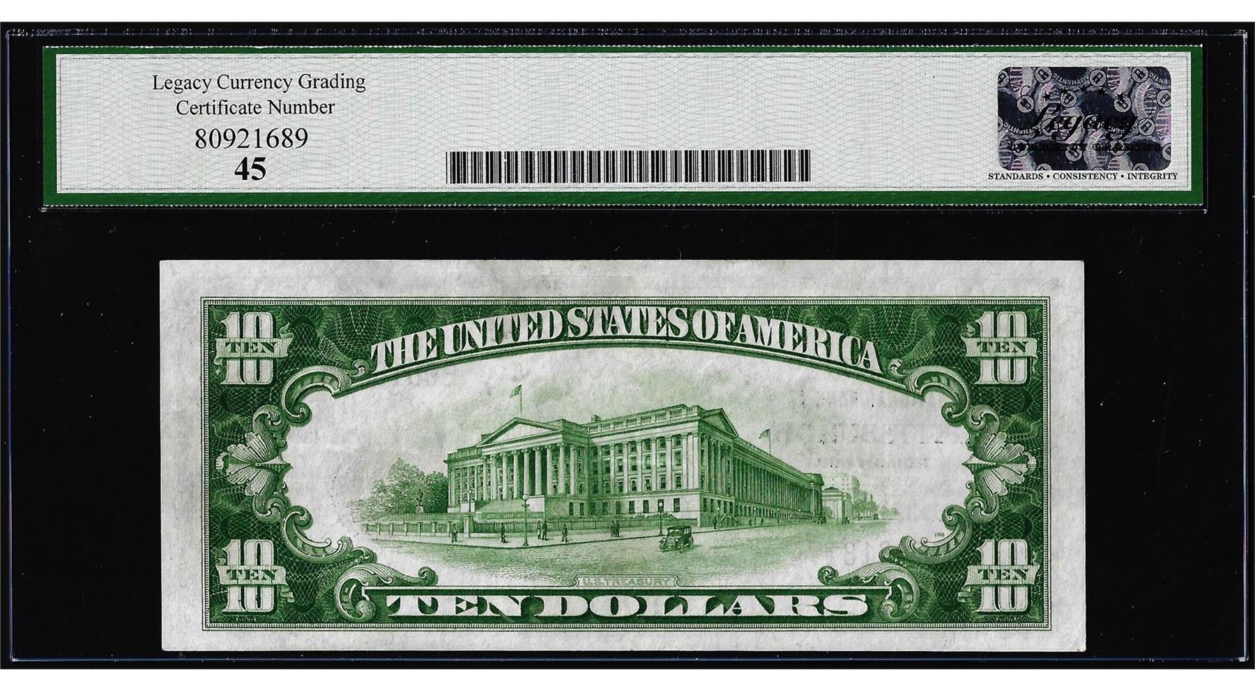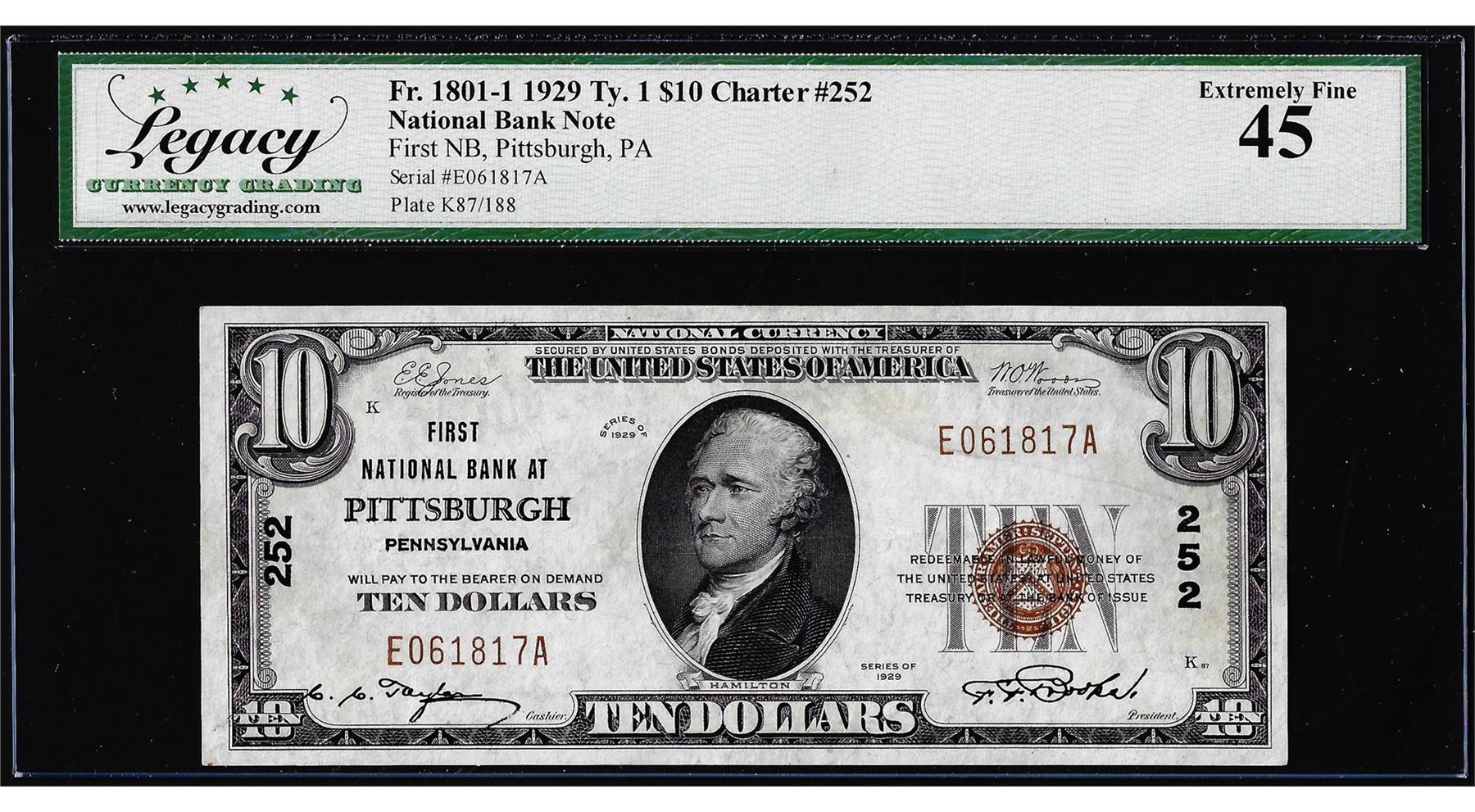 One 1929 $10 NB Pittsburgh, PA CH# 252 National Currency Note Legacy Extremely Fine 45. Legacy Graded.