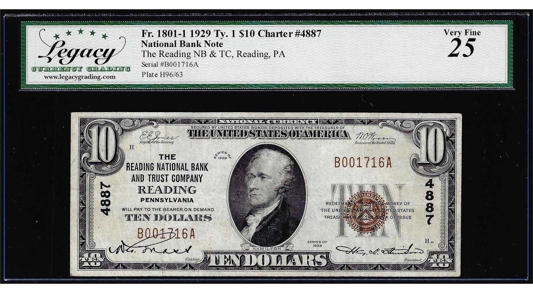 One 1929 $10 NB Reading, PA CH# 4887 Fr.1801-1 National Currency Note Legacy Very Fine 25. Legacy Graded.