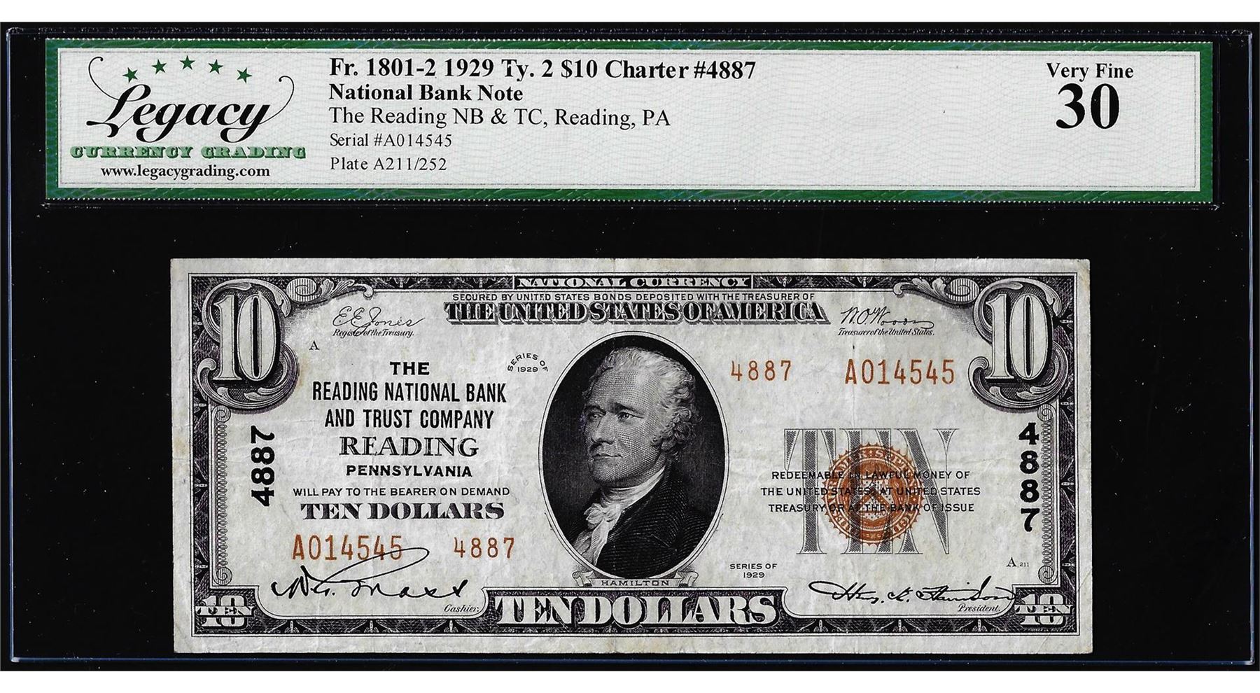 One 1929 $10 NB Reading, PA CH# 4887 Fr.1801-2 National Currency Note Legacy Very Fine 30. Legacy Graded.