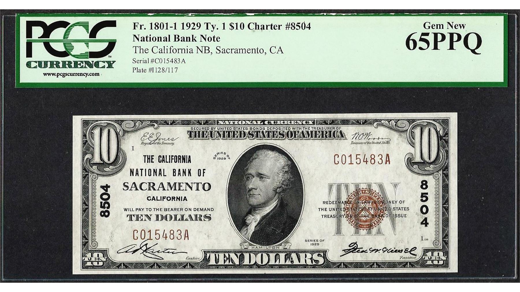 One 1929 $10 NB of Sacramento, CA CH# 8504 National Currency Note PCGS Gem New 65PPQ. PCGS Graded.