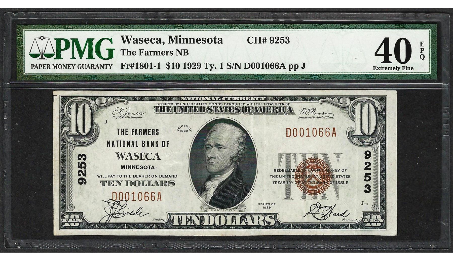 One 1929 $10 NB of Waseca, MN National Currency Note CH# 9253 PMG Extremely Fine 40EPQ. PMG Certified.