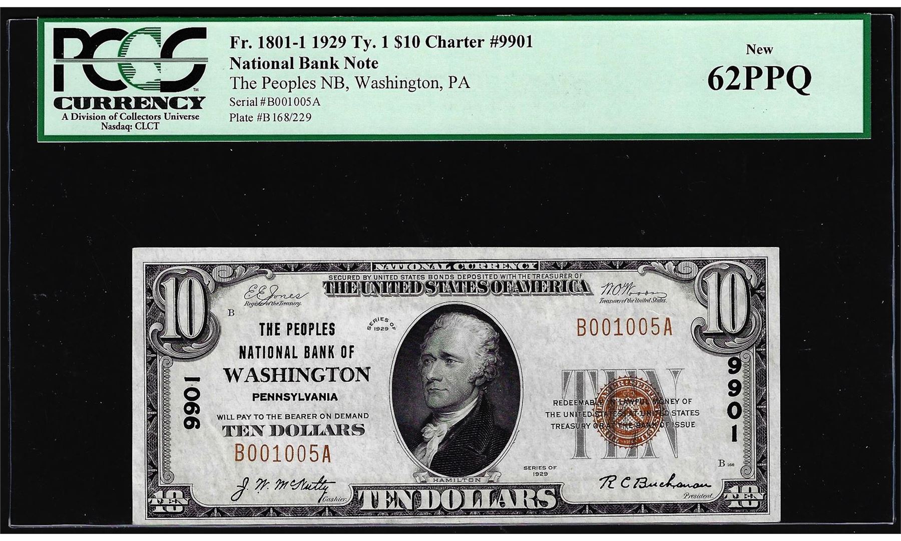 One 1929 $10 NB of Washington, PA CH# 9901 National Currency Note PCGS New 62PPQ. PCGS Graded.