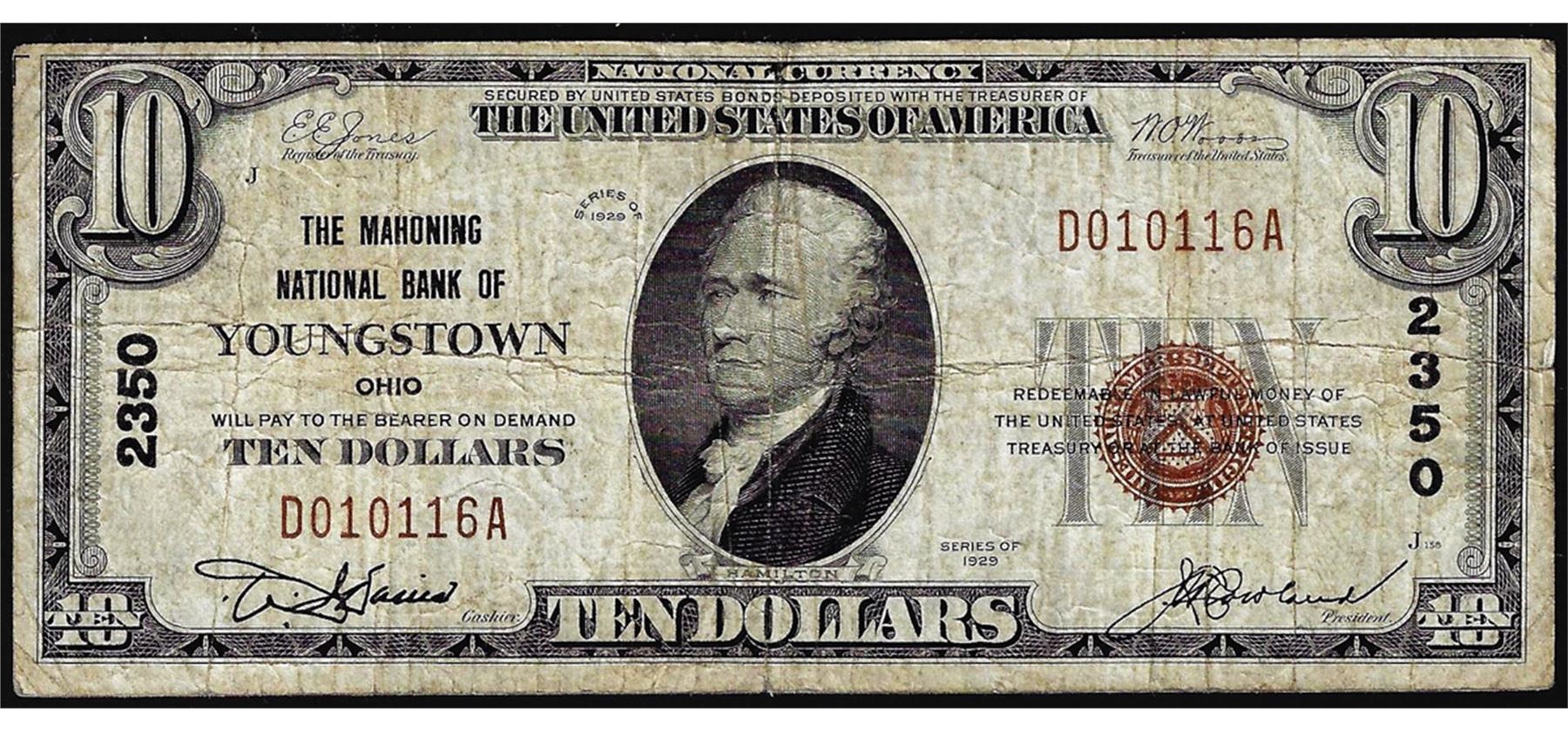 One 1929 $10 NB of Youngstown, OH CH# 2350 National Currency Note.
