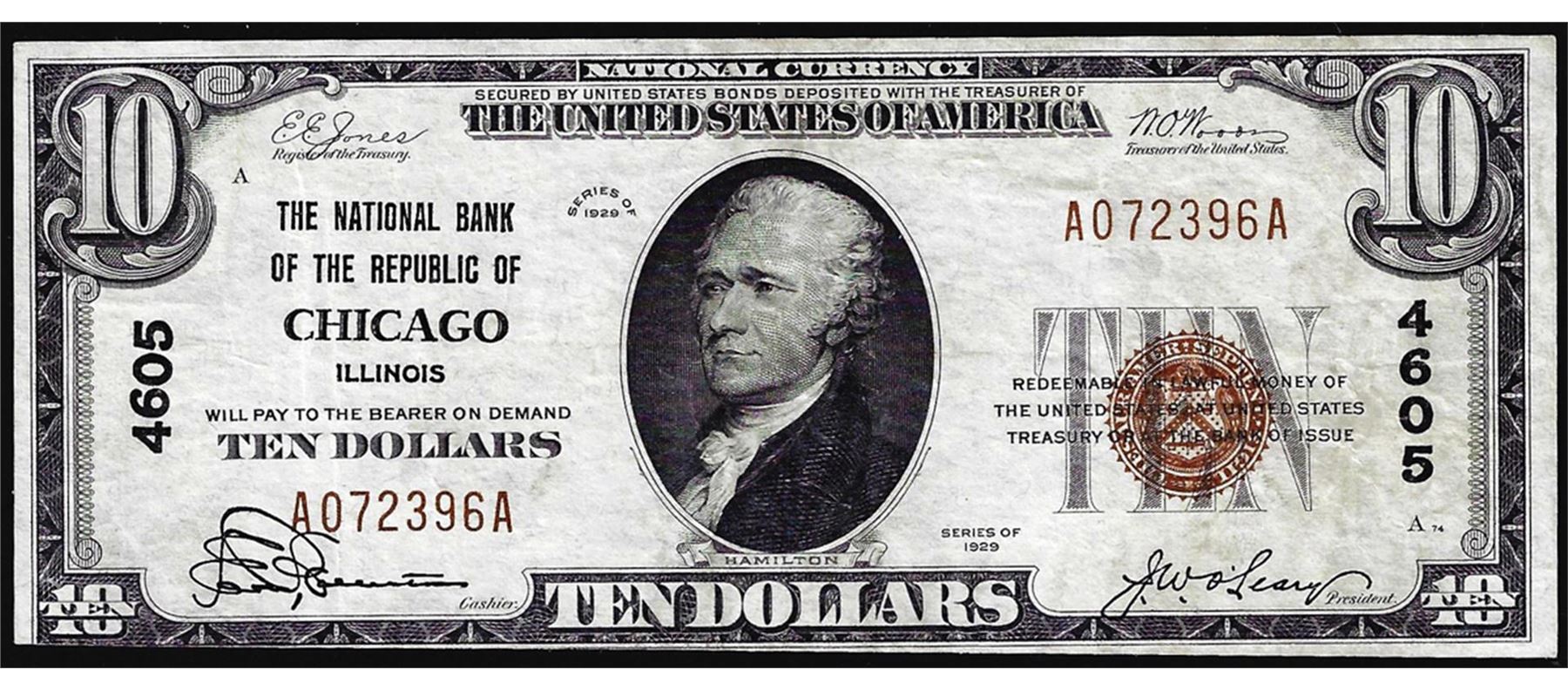 One 1929 $10 NB of the Republic Chicago, IL CH# 4605 National Currency Note.
