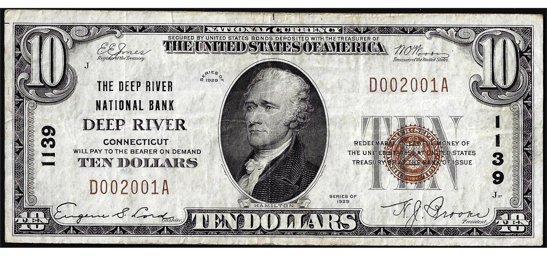 1929 $10 National Bank Deep River, Connecticut CH# 1139 National Currency Note