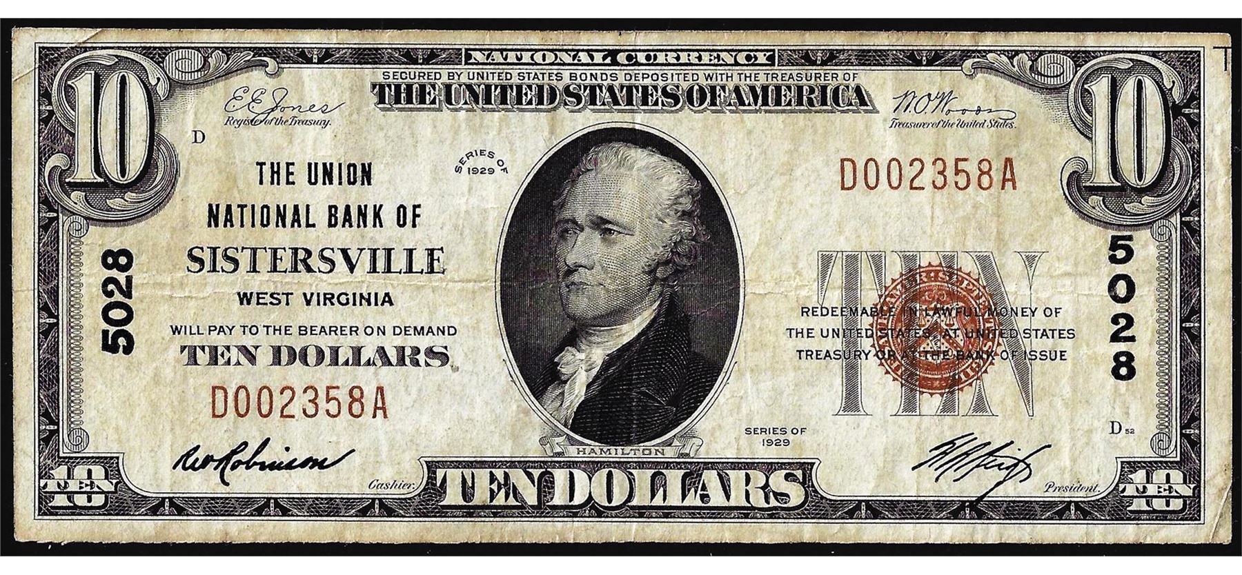 One 1929 $10 National Bank of Sistersville, West Virginia CH# 5028 National Currency Note.