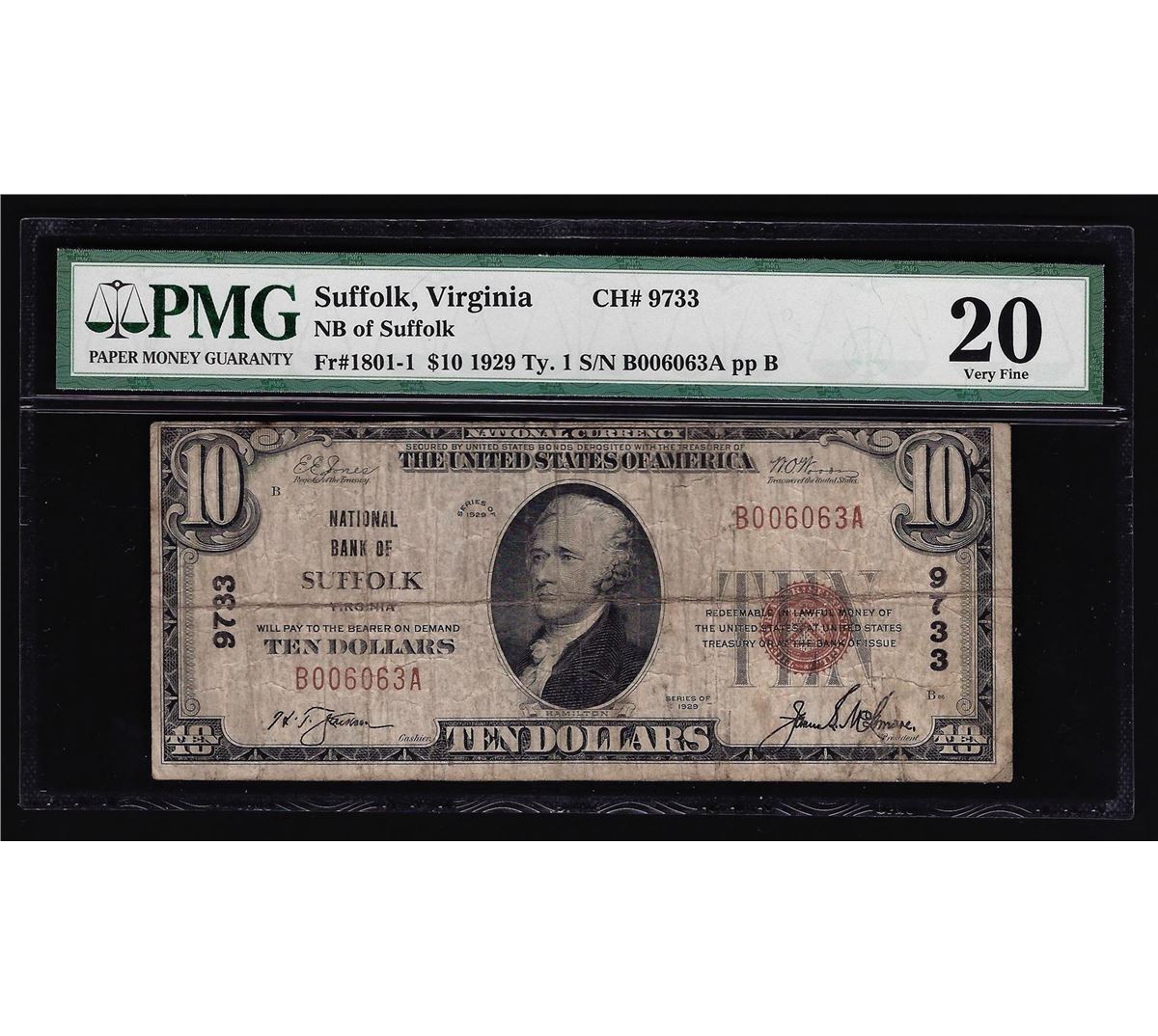 One 1929 $10 National Bank of Suffolk Virginia Currency Note PMG VF20. PMG Certified.